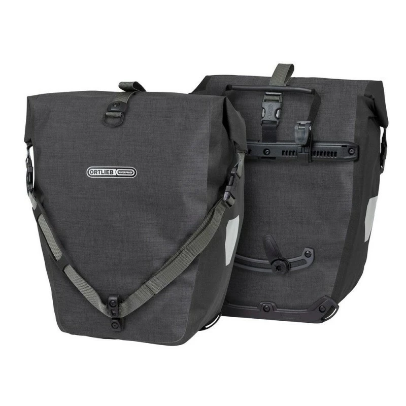 La paire de sacoches Ortlieb Back Roller Plus granit black est parfaite pour la randonnée à vélo ou vos déplacements urbains. Conçues avec une toile résistante sans PVC et 100% étanches, les sacoches Ortlieb back roller plus sont dotés d’un système de fixation au porte bagage rapide et efficace qui s’adaptera à la très grande majorité des portes bagages du marché.
