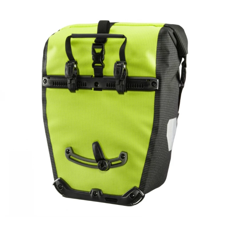 High Visibility signifie chez ORTLIEB : la pratique du cyclisme avec une protection maximum. La toile de Cordura jaune fluo est étanche et est recouverte d’un revêtement polyuréthane. Les coutures ont toutes été réalisées avec un fil réfléchissant, tout comme celles de la partie en toile noire. Dans la lumière des phares, la sacoche toute entière se transforme alors en un réflecteur bien visible, pour votre plus grande sécurité. Dotés du système Quick-Lock2.1 mis au point, cette paire de sacoches de vélo garantissent une sécurité maximale. Grâce à leur toile aux coloris jaune vif et noir, vous susciterez une attention appropriée au petit matin, au crépuscule comme par mauvais temps.